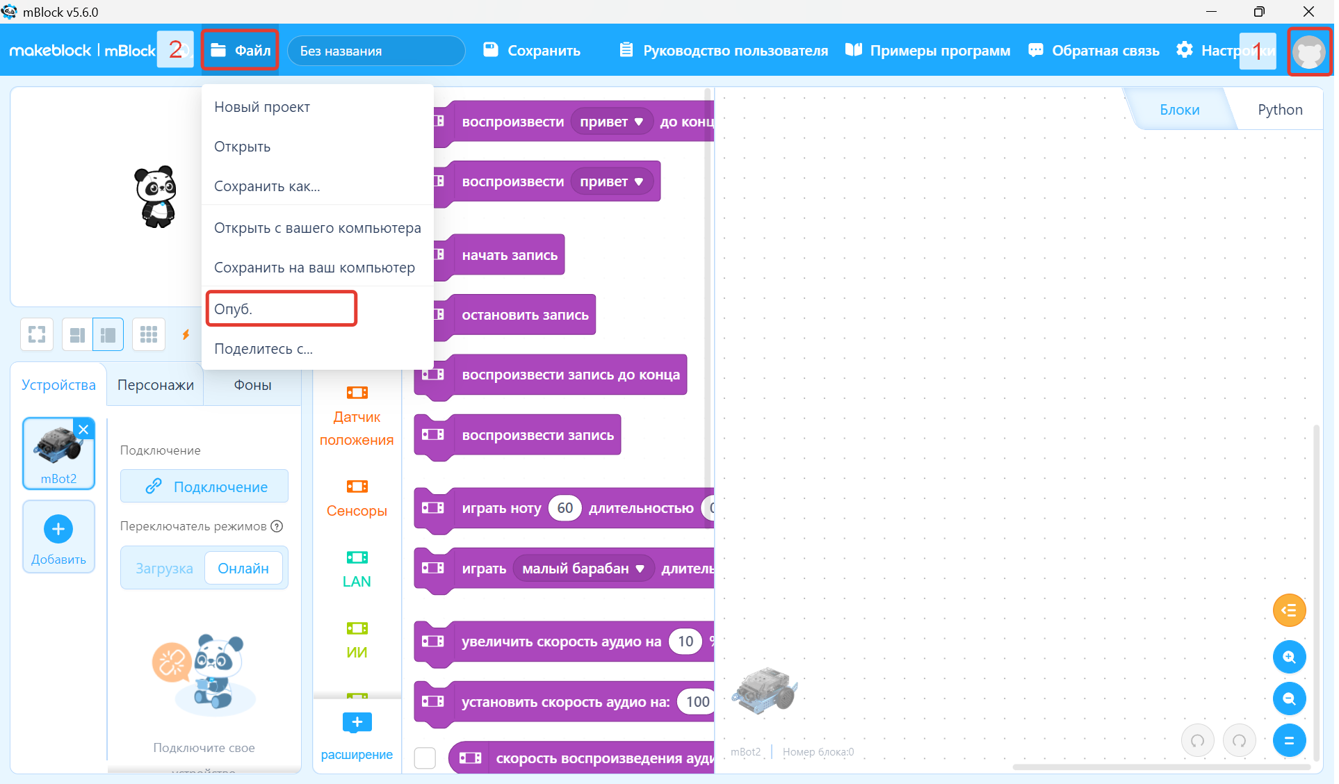 - Откройте файл с проектом в среде mBlock 5 и зайдите в свой профиль makeblock.